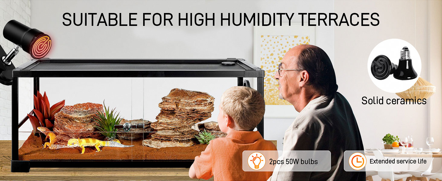 This 2-pack of 50W ceramic infrared heat emitters delivers steady, invisible warmth ideal for reptiles and small pets. Designed with a durable ceramic element for humid environments, these bulbs provide up to 15,000 hours of continuous heat without emitting visible light, ensuring your pets stay comfortable and undisturbed. Compatible with standard E26/E27 sockets, they offer a reliable, long-lasting heating solution for terrariums and brooders.