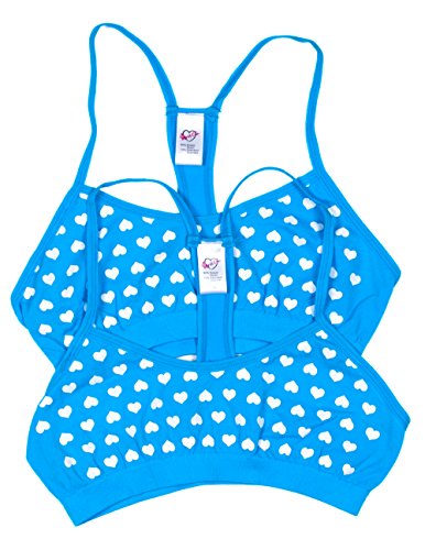 The Gyrl Co. Girls racerback style training bras are perfect for the little girl in your life. This 2-pack value training bra has it all with support and all day comfort from the moisture wicking Nylon/Spandex fabric blend. The cool blue color is perfectly offset by the tiny white heart print making this one of the cutest and most practical training bras we have ever offered. Garment Dimensions: Small=Chest 22''-24'' Medium=24''-28'' Large=28''-32''