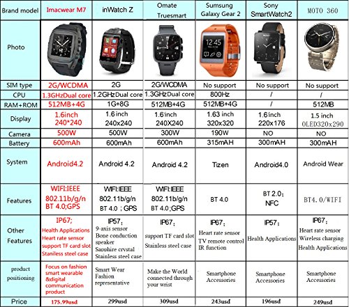 Specification: OS Version: Android 4.2.2 CPU: MTK6572 Cortex A7 Dual -core Processor Speed: (max) : 1.3GHz RAM: 512MB ROM: 4GB External Memory: Support up to 32GB Display Size: 1.54 Inch Display Resolution: 240 x 240 Touch Screen: IPS capacitivice screen Multi-touch: Support 2 Point Frequency: 2G:GSM/EDGE/GPRS(850/900/1800/1900MHz) 3G:WCDMA:2100MHz GPS: Presciseness within 10m, Built-in GPS, supprt A-GPS, google map or other map Bluetooth: Bluetooth 4.0/3.0+EDR(Bluetooth earphone Hi-Fi quality transmission and receiving) Adobe Flash: Portable Wi-Fi Hotspot (3G Tethering) Google Play:Support Sensors: Proximity, Magnetic Field, Accelerometer, Gravity Mic and Speaker: Battery Size: 600mAh Li-ion---- can take out to change battery Usage Time: About 6 Hours Battery Standby: About 72 Hours WiFi: 802.11 b/g/n Camera Resolution: 5MP Video Resolution: 864x480 Material: Stainless Steal+Silicon Video Resolution: 864x480 Warranty: Non-artificial damage for one year Ports: 1 (WCDMA/GSM) micro SIM Card Slot Micro SD Card Slots Languages: Bahasa Indonesia, Bahasa Melayu, Czech, German, English, Spanish, Filipino,French, Italian, Magyar, Dutch, Portuguese (Brasil), Portuguese (Portugal), Vietnamese, Turkish, Greek, Russian, Hebrew, Arab, Thai, Korean, Japanese Media Formats: Video: MP4, 3GP Audio: MP3, WMA, AMR Graphic: JPG, GIF E-Book: PDF, TXT Dimensions: Size: 45*42.8*13.8mm Main Product Weight: 120g Packages: 1 × Watch Phone •1 × Charger box •1 × Screwdriver •1 × USB Cable •1 × User Manual