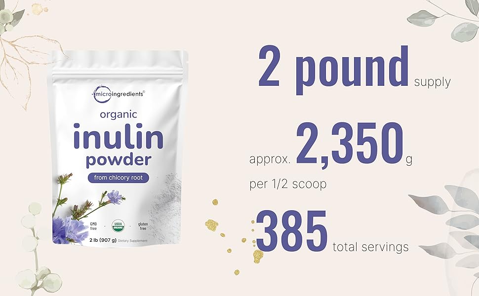 Micro Ingredients Organic Inulin Fiber Powder is a premium, 2lb bulk supply of pure, vegan-friendly chicory root inulin. Each scoop delivers 2,350mg of soluble prebiotic fiber designed to support digestive and gut health. This unflavored, non-GMO powder blends easily into beverages and recipes, offering a 385-day supply with no added sugars or artificial ingredients. Lab-tested for purity and potency, it’s the clean, natural choice for sustained digestive wellness.