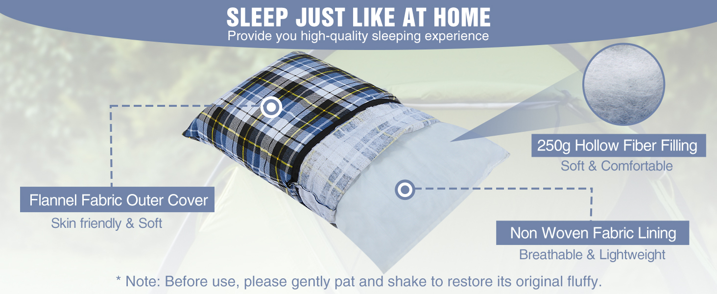 The REDCAMP Lightweight Camping Pillow combines ultra-soft flannel fabric with a 250g spun cotton filling to deliver exceptional comfort. Weighing only 0.7 lbs (320g), it’s designed for easy portability and fits perfectly with REDCAMP sleeping bags. Featuring a removable, washable pillowcase and storage bag, it ensures hygiene and convenience for all your outdoor adventures and travel needs.