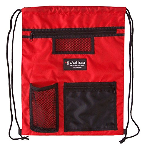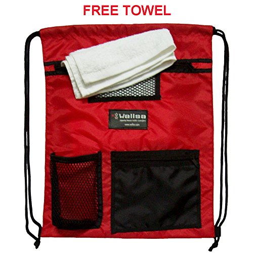 Drawstring Sackpack with 1 large divided Compartment with Ventair mesh window for the front zipper long pocket at the top to carry your used up gym towel or a gym tank top or a work out gear and let it "breathe". One small front zipper pocket at the bottom to store small items like your phone and wallet. One Mesh Bottle pocket. Ultra-handy drawstring backpack Sack while carrying that fits everything you need. More comfortable using experience in comparison to traditional drawstring bags. Sports drawstring sack is perfectly designed to be used as a sports or gym sack. Drawstring Sports Bag is perfectly designed to be used as a sports or gym sack. Free gift of white 100% cotton gym towel size 60cm x 40cm cm included inside the drawstring bag. Material: Polyester Style: Backpack Color: Red/Black Size Type: Regular (Approximate size 17.5" H x 13.5" W) Pockets: 1 Large Front Zipper Pocket at top with Vent-air. 1 Small front zipper pocket at the bottom. 1 Mesh Bottle pocket to hold a small size water bottle.