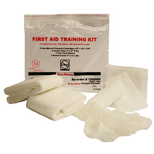 Help students explore their First Aid skills, especially utilization of available resources, with this cost-effective solution for first aid training! The large non-woven triangular bandages will spark participant creativity during splinting exercises! Use this kit to teach your students how to use direct pressure for bleeding control, treat soft tissue injuries, care for injuries to muscles, bones and joints (including splinting an injury using a sling and binder) as well as the importance of preventing disease transmission. Training kit includes: 1 roll of non-sterile conforming gauze(3" x 4.1 yards), 2 gauze pads(4" x 4"), 2 non-woven triangular bandages(42" x 42" x 59"), 1 pair of vinyl gloves, size large