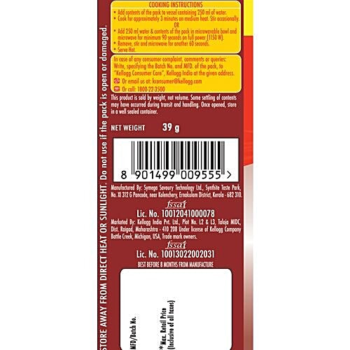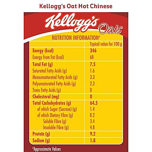 About @import url("https://www.desercart.com/static/froala_style_v2.min.css"); Oats is a wonder grain that has more soluble fibre than some grains like Wheat and Rice. Kelloggs Oats is sourced from a facility that processes wheat and almonds and may contain traces of Gluten and Almonds. Kelloggs Oats is naturally cholesterol-free and is a good source of protein and fibre. Kelloggs Oats also offers a wide range of variants and flavours like Masst Masala and Hot Chinese to choose from. Take care of the health of your heart, start your day the healthy way with the goodness of oats. Start off your day with a balanced, great-tasting breakfast that can put you on the fast track to good nutrition and better overall health. Start off your day with a balanced, great-tasting breakfast that can put you on the fast track to good nutrition and better overall health. Kelloggs fortified oats offer a low-fat, nutrient-dense, cholesterol-free food that encourages breakfast consumption. A quick and convenient breakfast in just 3 minutes. You can count on Kellogg for great-tasting, convenient, and affordable choices that meet their nutrition needs. Top with fresh fruit, dry fruit, nuts or cinnamon to enjoy the healthy and nutritious breakfast.