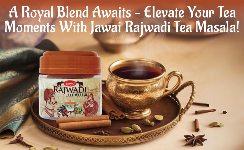 JAWAI Rajwadi Tea Masala is a 100g jar of authentic, caffeine-free chai masala powder made from 100% natural, allergen-free spices sourced from Rajasthan. This antioxidant-rich blend combines ginger, black pepper, cinnamon, cardamom, and cloves to enhance tea flavor while boosting immunity, relieving cold and cough symptoms, and aiding digestion. Packaged in a convenient jar, it’s a perfect daily ritual for health-conscious tea lovers seeking a royal twist.