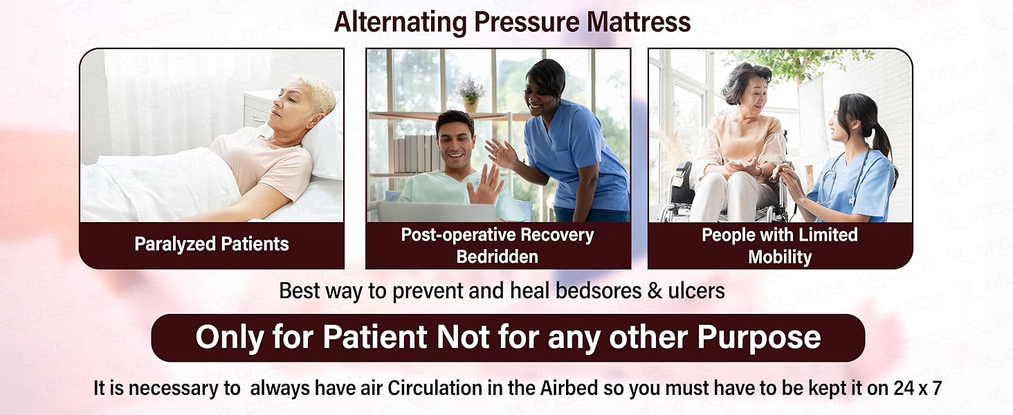 The OTICA Medical Air Bed Mattress is a premium 78x39 inch vinyl mattress designed to prevent bedsores and aid pain relief through alternating pressure therapy. Featuring a variable pressure dial, low noise pump, and durable waterproof material, it offers hospital-grade comfort and portability. Ideal for adults requiring extended bed rest, it combines advanced functionality with ease of use and reliable performance.