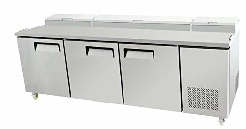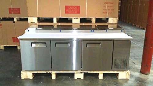 Features / Specifications: -3 Doors with 26 Cubic Feet! Very high grade 304 stainless steel interior and exterior! -ALL PANS INCLUDED FREE FOR A LIMITED TIME! -3 Shelves -Lock fitted -Digital controller -Forced air cooling -Adjustable 33-41° F Temperature -Electro-Mechanical Thermostat -Side Mount Compressor for improved efficiencies -Adjustable Wire Shelves -19 1/2" Deep Poly Cutting Board -Self closing doors -Ergonomic design -Recessed door handles -GN pan suitable -High grade 304 stainless steel interior & exterior -Power Requirements: 9 Amps @ 110-120v AC (Regular 3 prong outlet) -Actual Dimensions: 93" W x 33" D x 40.7" H -Net Weight: 792 lbs. Shipping weight (we double crate each item) 850 pounds -(2) Locking,(2) Non-Locking Casters -ETL listed; conforms to NSF Standard 7 -5 YEAR COMPRESSOR WARRANTY INCLUDED. 1 YEAR ALL ADDITIONAL PARTS -Please include a good contact phone number when you order. We need this for the shipping company and cannot ship without it. A $45 liftgate fee will be charged if this item is to be shipped to a residence. We highly recommend having it shipped to a business.