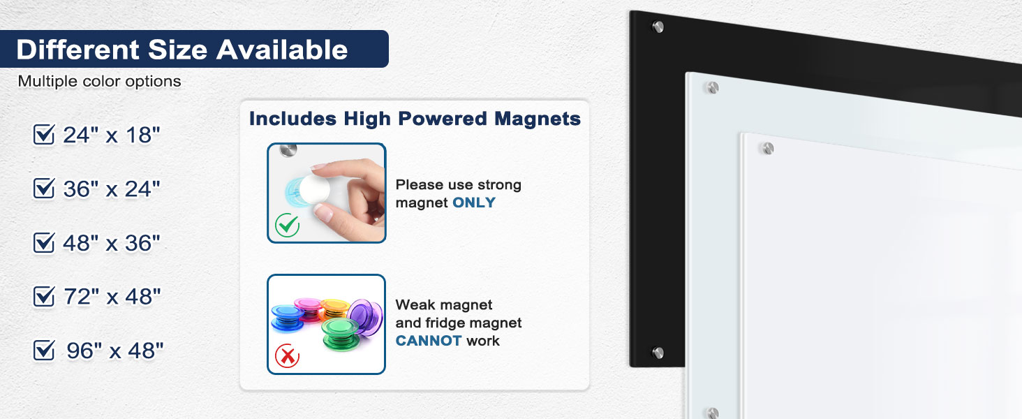 I want to love this, I really do. The glass is of good quality and it is indeed magnetic. HOWEVER, the mounting hardware deserves a failing grade. The drywall anchors are trash, but you have to use them for the provided screws... which you have to use the provided screws for the provided metal mounting pieces. The real kicker here is after about an hour of cursing. The finishing caps to cover your mounting hardware DON'T FIT. We thought they might be snap on but the diameter is just too small to function. Also, not a big deal but the included magnets came chipped