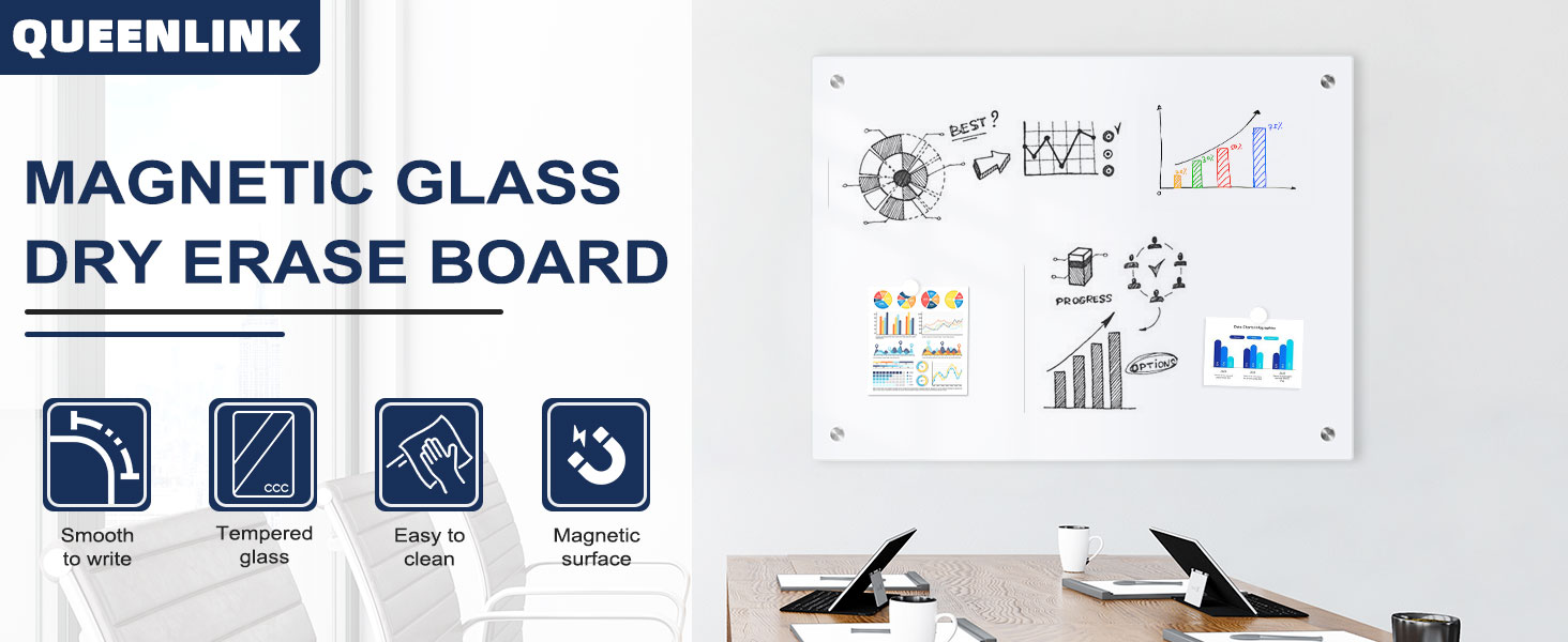 The QUEENLINK Magnetic Glass Whiteboard is a premium 48" x 36" frameless dry erase board crafted from durable 4mm tempered glass. Featuring a smooth, ultra-white, stain-resistant surface with anti-ghosting technology, it supports strong magnets for versatile document display. Designed for easy vertical or horizontal installation, it includes a marker tray, 3 powerful magnets, and a marker pen—perfect for professional offices, classrooms, or home workspaces seeking a sleek, modern collaboration tool.