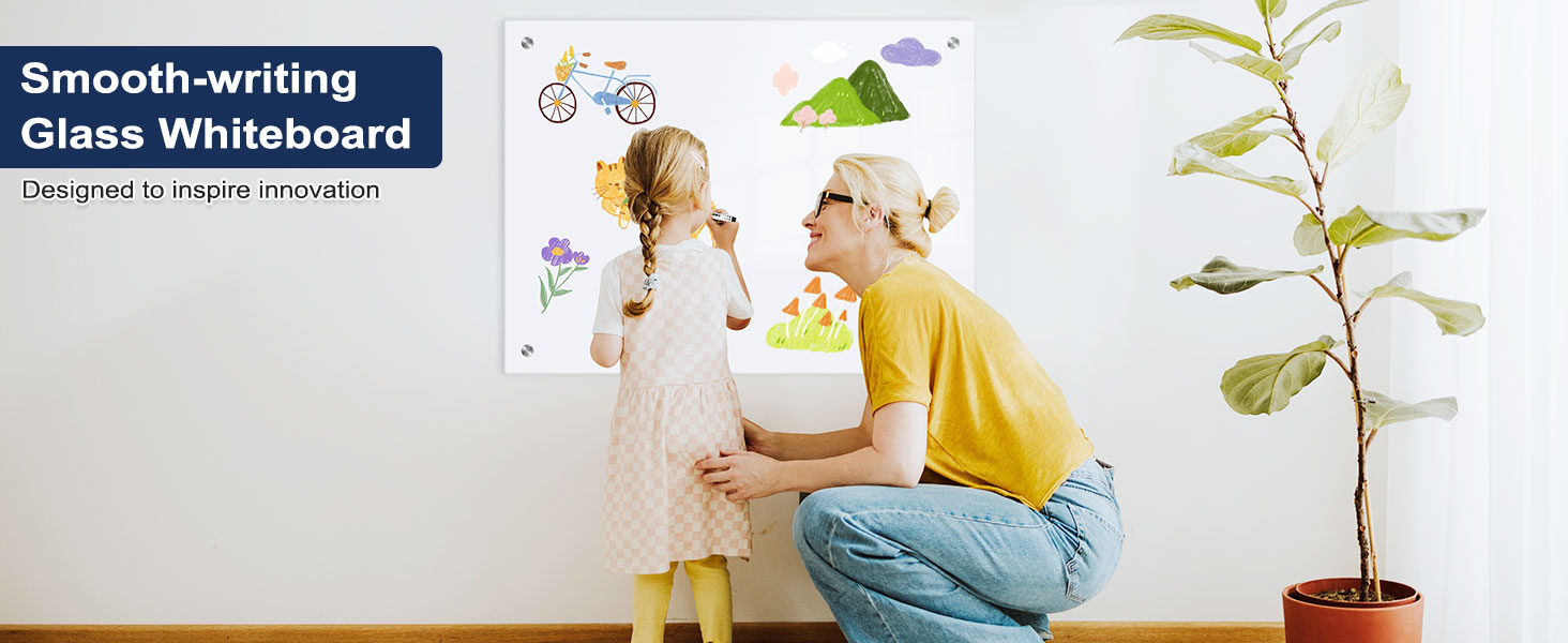 The template is just a piece of paper (no guide markings) so installation is tricky, and the glass whiteboard is attractive but needs strong magnets if you want to put anything thicker than light paper on it.