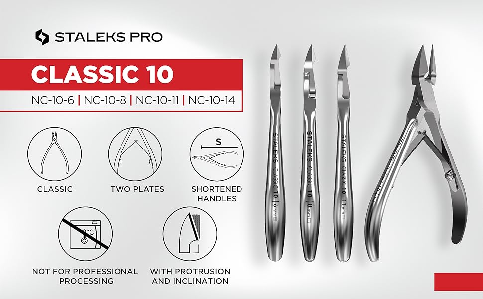 The StaleksCLASSIC 10 Cuticle Nippers feature 14 mm stainless steel blades designed for precise trimming of cuticles and thickened skin. Ergonomically crafted handles provide a comfortable, steady grip, while a durable double spring ensures smooth, consistent operation. Ideal for home manicure and pedicure care, this tool combines professional-grade quality with hygienic stainless steel construction.