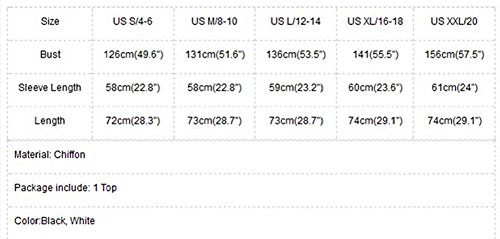 Material: Chiffon Package include: 1 Top Color:White,Black,Rose,Green Attention: Size may be 2cm/1 inch inaccuracy due to hand measure; Color may be little different due to monitor, thanks for your understanding! This the best gift for your family or friends.