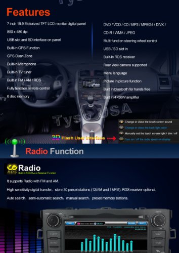 Specially designed for Toyota Auris (2007-2011) **Note** * pls make sure the unit fit for your car(compare the size) before order *Pls note that a harness may required to install the product on vehicles that have JBL system. And this item doesn't include this harness. *Usually we suggest you go to a professional installer. *If you have any questions about the unit,Please email us back,We will solve to your satisfaction Description 7 inch LCD Display Built- in GPS navigation system (Win CE6.0 Operating System) Rear Camera Included, can be used for car reversing when connected to rear view monitor Built-in Bluetooth for hands free call Built in USB slot Dual Zone function : drive car listen to music while viewing the map Compatible with DVD/DVD-RW/CD/MP4/MP3/GPG-CD/DIVX Built-in TV tuner Built in FM/AM/RDS Built-in Microphone Built in 4×50w amplifier Ipod control supported Full Function Touch Screen Accessories User Manual, GPS antenna, , Remote Control, Wire Harness With Radio Antenna Adaptor,USB Cable, Ipod Cable, A/V-Out Cable, External Microphone, 2GB Micro SD Card with Maps, ISO Cable, Navinio Cable, Rear Camera By Express: Generally, about 7-12 working days to UK, USA, AU.CA.We ship the item through express service like DHL, UPS,FEDEX.