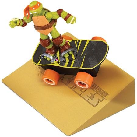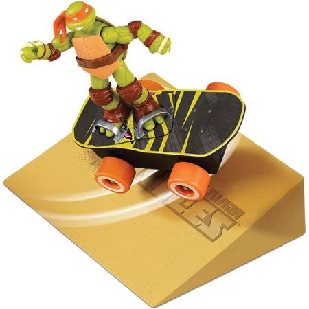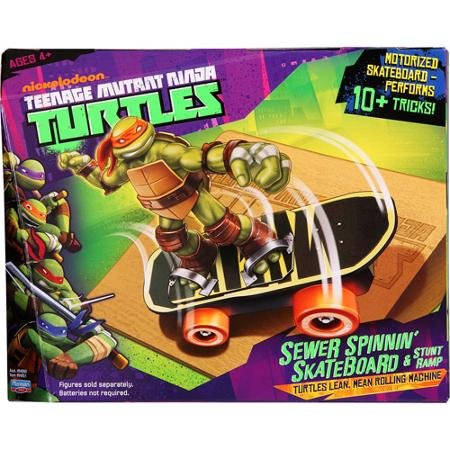 Add to your Teenage Mutant Ninja fan's toy collection with this cool Teenage Mutant Ninja Turtles Sewer Skateboard. This Ninja Turtles skateboard is compatible with each of the other pieces in the Basic Ninja Turtle Action Figures set (sold separately) and comes ready to roll. The Ninja Turtles Skateboard looks exactly like the skateboard that is featured on the television show. The Teenage Mutant Ninja Turtles Sewer Skateboard features a special Ninja Battle Boost Technology that enables it to perform more than 10 awesome skateboard tricks. This Ninja Turtle skateboard also comes with a stunt ramp for high-flying action. All your child has to do is place his or her favorite turtle character onto the board, get it revved up and watch it go. This skateboard vehicle accessory would make a fine addition to a Teenage Mutant Ninja Turtles action figure collection.