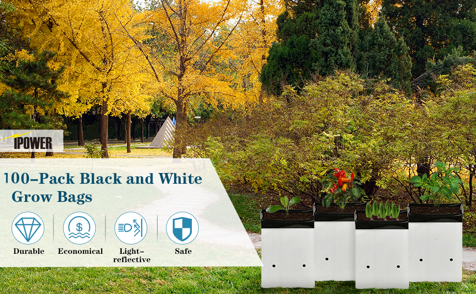 The iPower 100-Pack 3 Gallon Grow Bags are designed for optimal plant growth, featuring a reflective black-and-white material that keeps roots cool, excellent drainage for healthy plants, and made from high-quality virgin PE for durability. Perfect for a variety of horticultural applications, these bags are a must-have for any serious gardener.