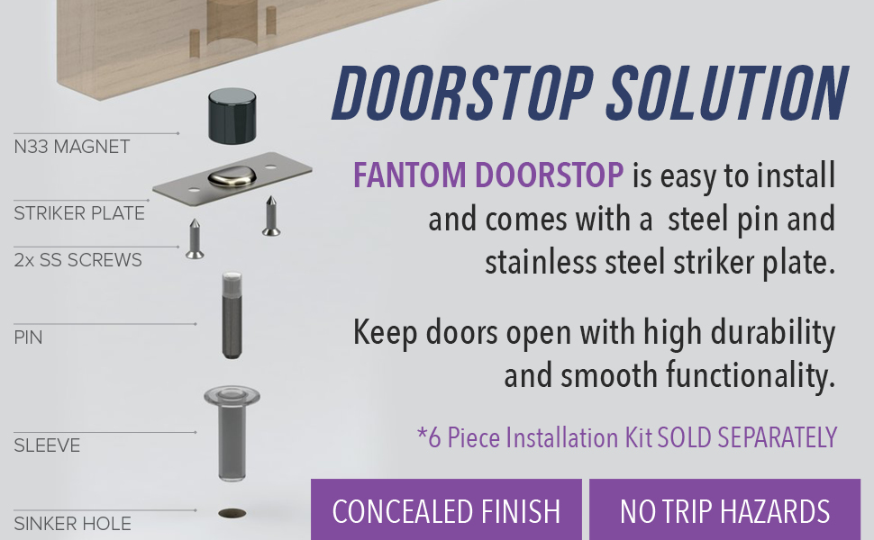 Review written by hubby.Tried it in the bathroom. Drilled a hole in the floor. Everything was lined up, but door just swung past it. I triple checked the installation. Everything was perfectly aligned. Still didn't work. So I bought a Big Floor mount to cover the hole in the floor. EXACTLY what I was trying to Avoid.A year later.....Still had this product, so I decided to use it in the kitchen to keep the door from hitting the fridge. BIG MISTAKE #2.Again followed the instruction to the "T.". Because the kitchen door is an exterior door, It's heavier and I didn't want to it to damage the fridge from the door handle hitting it. So, again, the magnet wasn't strong enough to lift the pin out of the floor and stop the door. So now I have a another hole in another floor. (This is when I began cursing myself for believing again that it would work). Bought another commercial door stop to cover the gaping hole in the floor and now have a big ugly door stop that is a trip hazard and a toe buster.This has to be said. I have 45 years of commercial construction, so I'm no novice. This product is a good concept, but horrible execution. Save the expense and and the holes you'll have to cover later, or repair / replace flooring. See photos to see how I temporarily covered the holes until I can replace the floor boards.YOU HAVE BEEN WARNED!