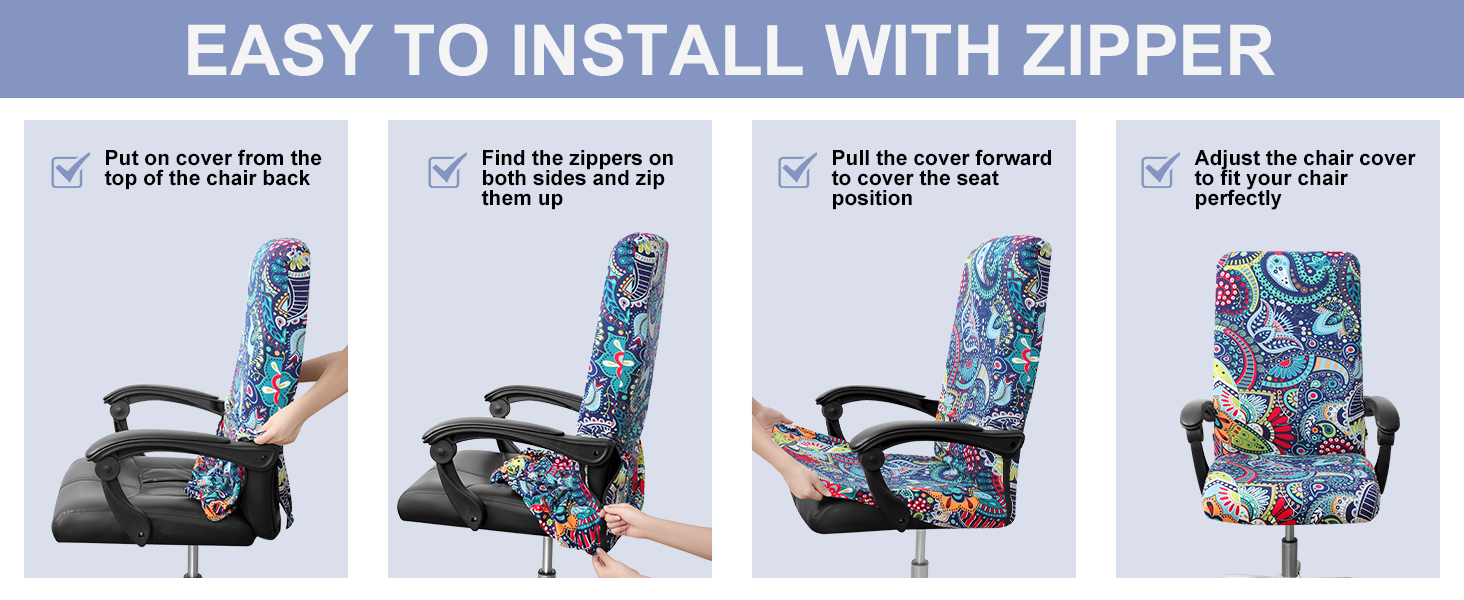 The Smiry Stretch Printed Office Computer Chair Cover is a durable, soft, and stylish spandex blend protector designed to fit most office chairs. Featuring dual side zippers and under-seat ties for a secure fit, it shields your chair from stains and wear while offering easy machine washability. Perfect for professionals seeking a quick, fashionable upgrade to their workspace.