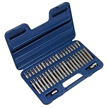 The Sealey AK219 is a professional 42-piece bit set featuring hardened Chrome Vanadium 6150 steel bits with a Rockwell hardness of 52-53 HRC. It includes TRX-Star, Hex, and Spline bits in multiple sizes, compatible with 3/8" and 1/2" square drives. Packaged in a compact carry-case with an inclined tray, this set offers durability, versatility, and quick access for demanding tasks.