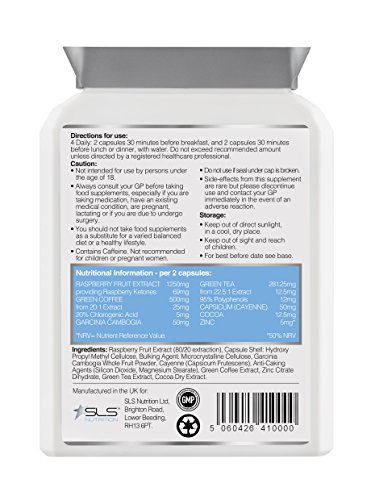 Are you as serious about health, fitness and general well-being as we are at SLS Nutrition? If so, you'll want to continue reading. SLS Nutrition has developed a brand new formula comprising of Raspberry Ketones and Garcinia Cambogia. Our unique Complex combines two of the best natural weight loss ingredients which could help to aid and achieve the weight loss goals of both men and women.Ketones are a naturally occurring chemical compound present in several fruits, including Raspberries. Ketones also give Raspberries their pleasant aroma. This very same compound could also help you to break down, bind and burn fat, increase your metabolism and suppress your appetite, as well as help regulate your blood sugar levels. The other key ingredient is Garcinia Cambogia. This amazing fruit could help you to inhibit fat production, especially fat produced from excessive dietary carbohydrates and calories. It could also help you to reduce cravings as well. This subsequently reduces snacking throughout the day which is a major factor with weight gain. Garcinia Cambogia has great antioxidant properties, and may also help to keep your cholesterol levels under control too. Our Complex also contains Green Coffee, Green Tea and Zinc, as well as Cayenne and Cocoa to further promote weight loss, as well as providing other added health benefits.This product is the ultimate supplement for you, comprising of great quality ingredients that are perfectly balanced in order for you to achieve great results. It is also Vegetarian and Vegan friendly.SLS Nutrition supplements are manufactured in the UK and conform to strict GMP standards. This helps to ensure that we consistently manufacture premium quality products for our customers.We always strive for complete customer satisfaction. Although we are sure you will love our products, for peace of mind we offer a 30 day 100% money back guarantee!