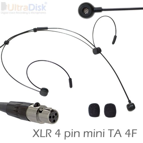 UltraDisk 4092 4 pin mini XLR TA 4F Switchcraft connection Compatible with models, Shure PGX1, Shure SC1, Shure SLX1, Shure U1, Shure ULX1, Shure UR1, Shure UR1M, Shure UT1, Shure TOA, WM4300 ,Trantec s5.3, Trantec s5.5, Carvin SL UX16-BP, JTS SL, Beyerdynamic The Headset Microphone Black a frame of only 3mm diameter unidirectional Headset adopts a 6mm diameter Micro cardiod unidirectional transducer. Fitting 4 pin mini XLR TA 4F Transmitters The UltraDisk Head worn Head set microphones are perfect for wireless body pack transmitters, broadcast radio & professional stage performance use. These stylish lightweight microphones are adjustable for all head sizes,stage entertainers, singing, dancing and commercial exhibitions, the lightweight and simple design enables the headset to be worn for long periods of time with maximum comfort and freedom of movement. 1. Lightweight design, perfect for wearing for long periods of time / performances.2. With a smooth steel ear-hang, soft and flexible ear-hook giving you a more comfortable and stable wear.3. Unidirectional cartridge. 5. The demountable mic arm can be positioned on the right or left .6. All metal surfaces are protected by alkali-proof, acid-proof and wear-resistance coatings, demonstrating its excellent mechanical properties.7. Black colour 8. Different styles of plug for choices, available in skin / beige or black, very convenient to configure with various kinds of wireless headset transmitting systems body packs. Technical : Directivity: Unidirectional Mic diameter: 6.0*5.0mm Sensitivity: - 47dB+/-2dBFrequency Range: 20-20KHzOutput Impedance: ;2.2K Operating Voltage: 2.0V-10V. DC PiP SNR: 58dB Wire: 1M Connection: UltraDisk 4092 4 pin mini XLR TA 4F Switchcraft connection Shure PGX1, Shure SC1, Shure SLX1, Shure U1, Shure ULX1, Shure UR1, Shure UR1M, Shure UT1, Shure TOA, WM4300 ,Trantec s5.3, Trantec s5.5, Carvin SL UX16-BP, JTS SL, Beyerdynamic
