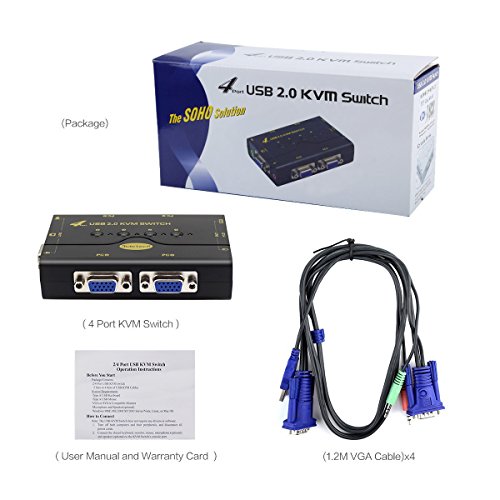 Features: Support Dos, Windows and Mac Operating System Max Resolution support 2048 x1536 Including Audio Speaker and microphone Switch work signal light, Indicates that the currently displayed LED address of the LED is on Support USB2.0 and Connect USB Hub Sharing for USB peripheral device No need adapter for power supply. Interface: Control: 1 x USB Type A for Keyboard 1 x USB Type A for Mouse 1 x USB USB Hub for Printer 1 X VGA Type A for Monitor 1 X Mini Stereo Jack for Speaker (Green) 1 x Mini Stereo Jack for microphone (Pink) Input: 4 X VGA Type A for Computers Package List: 1 x 4 Port KVM Switch 4 x 1.2M VGA Cable 1 x User Manual 1 x Warranty Card Description It is supporting Multiple computers or server (keyboards, Video, Audio and Mouse) KVM Switch, it just needing one set USB keyboard and mouse connecting with a monitor to control or view Computers or server. The KVM swith with USB Hub interface is supporting U disk and other USB devices, It is convenient for copy and read dates/documents.