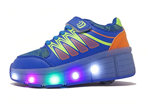 Size Chart The best way to get correct size is to measure the Insole Length of your kid's normal shoes, and choose the size according to the insole length on the below description. 9 UK Child --- Insole length 18cm, fit foot length 17.5cm 9.5 UK Child --- Insole length 18.5cm, fit foot length 18cm 10 UK Child --- Insole length 19.5cm, fit foot length 19cm 11 UK Child --- Insole length 20cm, fit foot length 19.5cm 12 UK Child --- Insole length 20.5cm, fit foot length 20cm 13 UK Child --- Insole length 21.5cm, fit foot length 21cm 1 UK --- Insole length 22cm, fit foot length 21.5cm 2 UK --- Insole length 22.5cm, fit foot length 22cm 2.5 UK --- Insole length 23cm, fit foot length 22.5cm 3.5 UK --- Insole length 23.5cm, fit foot length 23cm Description 1. Suitable for training, athletic, sports, and fun. 2. Concealed, retractable wheels on the outsole. The outsole is made of qualified rubber, durable and non-slip. Tips 1. Shoes can be cleaned with soft fabric. But can not be washed. 2. Beginner please be careful when you slip. 3. For safety reasons, children should be accompanied by an adult when using these shoes. 4. Size: please allow 0-0.3cm difference because of manual measurement. Package includes 1 x pair of shoes 1 x charging cable 1 x English user manual
