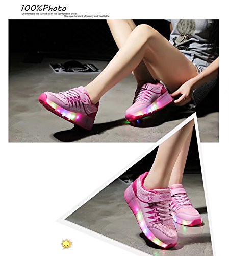 Size Chart The best way to get correct size is to measure the Insole Length of your kid's normal shoes, and choose the size according to the insole length on the below description. 9 UK Child (28 EU) --- Insole length 18cm, fit foot length 17.5cm 9.5 UK Child (29 EU) --- Insole length 18.5cm, fit foot length 18cm 10 UK Child (30 EU) --- Insole length 19.5cm, fit foot length 19cm 11 UK Child (31 EU) --- Insole length 20cm, fit foot length 19.5cm 12 UK Child (32 EU) --- Insole length 20.5cm, fit foot length 20cm 13 UK Child (33 EU) --- Insole length 21.5cm, fit foot length 21cm 1 UK (34 EU) --- Insole length 22cm, fit foot length 21.5cm 2 UK (35 EU) --- Insole length 22.5cm, fit foot length 22cm 2.5 UK (36 EU) --- Insole length 23cm, fit foot length 22.5cm 3.5 UK (37 EU) --- Insole length 23.5cm, fit foot length 23cm Description 1. Suitable for training, athletic, sports, and fun. 2. Concealed, retractable wheels on the outsole. The outsole is made of qualified rubber, durable and non-slip. Tips 1. Shoes can be cleaned with soft fabric. But can not be washed. 2. Beginner please be careful when you slip. 3. For safety reasons, children should be accompanied by an adult when using these shoes. 4. Size: please allow 0-0.3cm difference because of manual measurement. Package includes 1 x pair of shoes 1 x charging cable 1 x English user manual