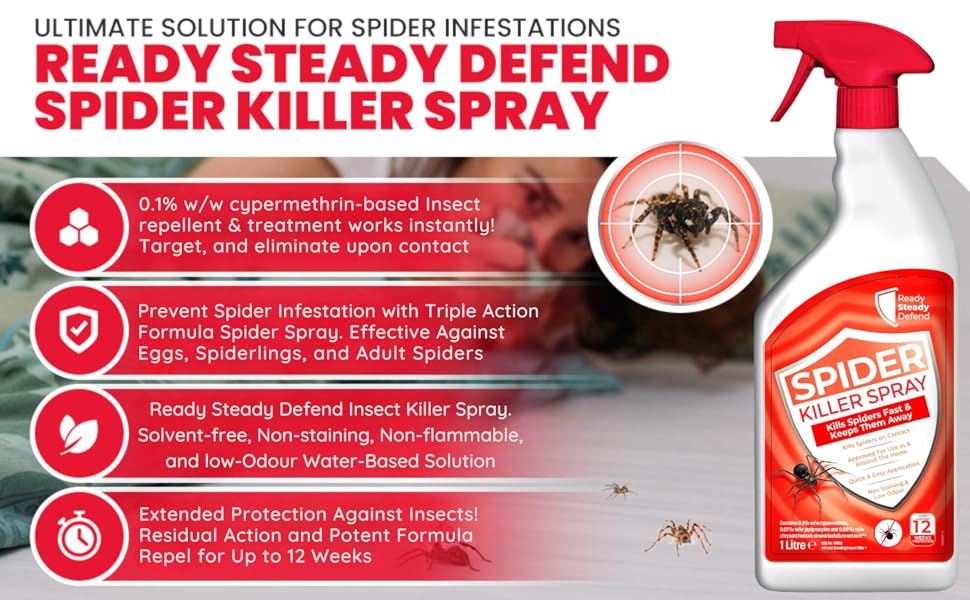 Ready Steady Defend’s Spider & Insect Killer & Repellent Spray offers a powerful, low-odour formula that provides up to 12 weeks of moisture-resistant spider protection. Approved for use on all surfaces and textiles, it’s perfect for both indoor and outdoor applications, delivering easy, effective pest control with a convenient spray design.