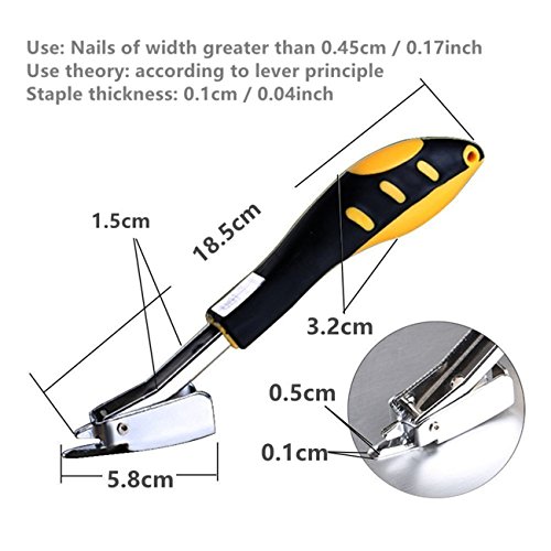 Heavy Duty Upholstery Staple Remover Features This staple remover is very lightweight and durable,the professional upholstery and office tool used for removing staples from any item. It can help you quickly remove deeply embedded staples in your furniture, upholstery, wood, floor, industrial, drywall, insulation bearing studs, or virtually where-ever else you find them, helping you skip straight to the constructive aspects of your project. A must have for any upholstery job. It will not damage the surface or upholstery. You needn't to waste time in preparation struggling to undo the work that has been done before you! Very easy to use, just insert the probe under staple and use the rocker mechanism to remove it with little effort.Also,The high quality non-slip handle keeps you safe while working. You can buy with confidence! Including 2 x Upholstery Staple Remover