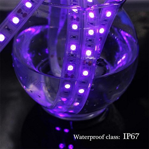 1. Original Blacklight * The blacklight strip gives out a true black light that is somewhat subdued. Many people think that a black light is supposed to be really bright in order to do it's job. Actually, bright lights that claim to be black lights are nothing more than regular lights with a color coating that turns the room a color. True black lights will glow a room with little actual "brightness". That is what this light does. This light will give an awesome glow to anything flourescent.2. 395nm---405nm UV light has a very widely application: 1.)aquariums for disinfection and sterilization.2.)fluoresce dried urine, odor of dogs cats small animals on carpets, stains, food stains.3.)test authenticate currency, passports etc.4.)promote plant growth.5.)induce and kill insect.6.)night fishing: fishes have Photo taxis, violet color is best used for lighting the float on the night while don't disturb the fish.7.)create amazing atmosphere: do a great job with UV body paints & fluorescents at party, DJ, stage, gallery, Halloween etc.Certificated with UL, CE, ROSH, very safe to use.Features of the Light Strip * Bright 5050 SMD UV LED light strip. * High intensity; plug&play. * Waterproof: YES, Indoor and outdoor, even directly underwater use. * 60 SMD UV ultraviolet LEDs per meter, total 300 LEDs for 5 meters. * Lift span: about 50,000+ hours. * Input volts: DC 12V (12V 5A or 6A suitable for 5 meters 5050 LED light strip). * Wavelength:395---405nm. * Viewing Angle : 120. Package Included 1 * IP67 Waterproof 5m 5050 UV LED Light StripTips: 1)100% original UV light strip: you can use a dollar to test it and it will have a fluorescence reaction.Please don't connect the light strip one by one. The right connection is a DC12V 5A or 6A power supply with one roll light strip.