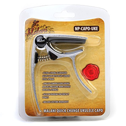 Join the army of musicians who rely on Malani Capos to deliver everytime...Whether you're playing down the local boozer, or onstage in front of thousands of people, its nice to have gear which just works - which is exactly what this capo does. And it works REALLY well. With this capo - you will get:• Great tuning every time: The angled compression string helps to apply the tension more evenly across all the strings - rather than focusing on the bass side of the strings which, by design, most trigger capo's concentrate on. • Fast capo changes: The simple design makes it easy to change capo position (or take the capo on and off) even during a song in less than a second. • No damage: With silicon padding on all of the points where the capo contacts the ukulele, your neck edge/fingerboard will receive no damage when fitting/moving/removing it. The silicon is guaranteed not to play havoc with any ukulele lacquers. • Reliability: Its really well made. The ultra-strong aluminium alloy body, and high-carbon steel spring take care of the build quality. Rest assured that it will serve you well. • Lifetime Warranty: Malani are so sure that it will serve you well, that you get a liifetime warranty against manufacturing defects!