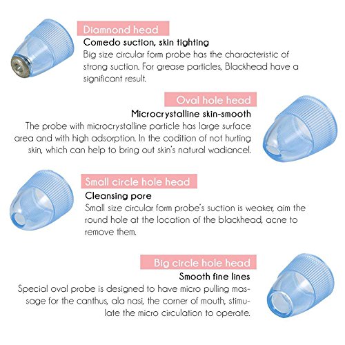 Features: 1. Diamond tips can be replaced, 4 working head for different parts of the use 2.LED display: 5-speed suction control 3. Simple button design 4.USB charging interface 5. Natural mineral microcrystalline diamond particle probe, remove the horny 6. Vacuum suction system to promote skin blood circulation Specifications: Material: ABS Product size: 18x4.7 x4.7cm Power Input :DC3V-4.2V Output: DC5V1A Lithium battery: 500mA Charge time:1 hour Pump suction:-180-270mmHg Application: Home use/Spa How to use: 1.Before using the remover, you must use a facial steamer or hot towel for 10 minutes to warm your face and open up your facial pores. 2.While using the remover, please do not stay at one spot. Move the remover around in a direction along the way (do not move back and forth). 3.After using the remover, please use a cold towel or cold mask to close your facial pores and after that apply face moisturizers. Warm prompt: 1. please don't use it on scarred skin. 2.Please don't wash the device. 3.After using it, take down the probe and use cotton swab with alcohol or cleansing cream to clean it. 4.Please clean the nozzle before and after use. 5.No need the dimaond sand to scrub with, can wash the nozzle in water. Also please use the facial toner on face after use Package Include: 1 x Machine 4 x Tip 1 x USB cable 1 x Charging base 1 x User manual