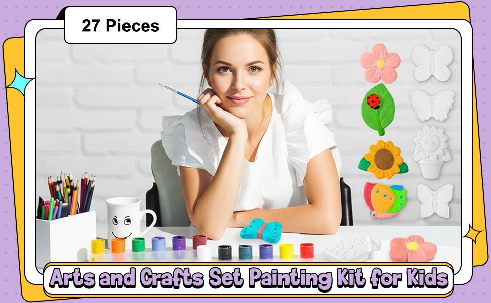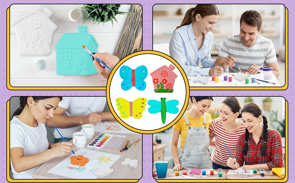 I bought these for a small Halloween party. The kids enjoyed choosing from the cute designs and painting them. However, I provided my own paints and paint brushes. I was disappointed by the stickers for the magnets. They did not stay on the designs so they fell off the refrigerator and broke when hitting the ground. I added hot glue to the rest of the set. Overall, a fun activity but not a lasting memento.