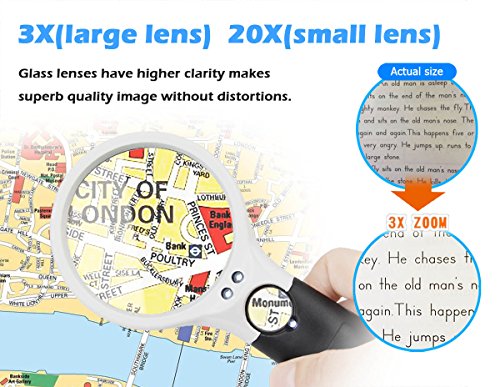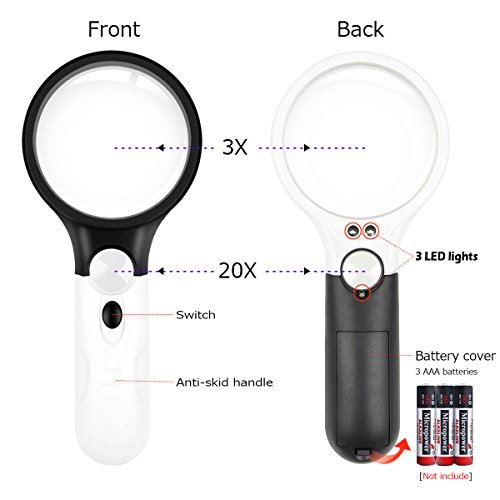 Top Quality 3 LED Lights 20X Handheld Mini Pocket Microscope Reading Magnifying Glass Lens Jewelry Loupe Cheap Price.*Features:-New and high quality magnifying glass lens-Compact and stylish design, comfortable ergonomic handle, portable light weight,very practical-Switch to turn lights on and off -Crystal clear texture to ensure clear view-Handle crafted in smooth curve and considerate shape for comfortable gripping-Great for reading, circuits, jewellery evaluating, etc.-Independent lighting design, 2 LEDs for the large lens and 1 LED for the small one to ensure better lighting effect.*Specifications:>Material: ABS and optical glass>Color: White and Black>Lighting: 3x LED light>Quantity: 1pcs>Weight: 168g>Handle length: approx.11cm>Size: 195mm(L)*85mm(W)*28mm(T)>Lens multiple: 3X for the large, 20X for the small>Lens dia.: 75mm for the large, 22mm for the small>Power: 3xAAA batteries (not included in the package) *Packing List:- 1 x 3X + 45X Magnification Magnifying Glass- 1 x User Manual