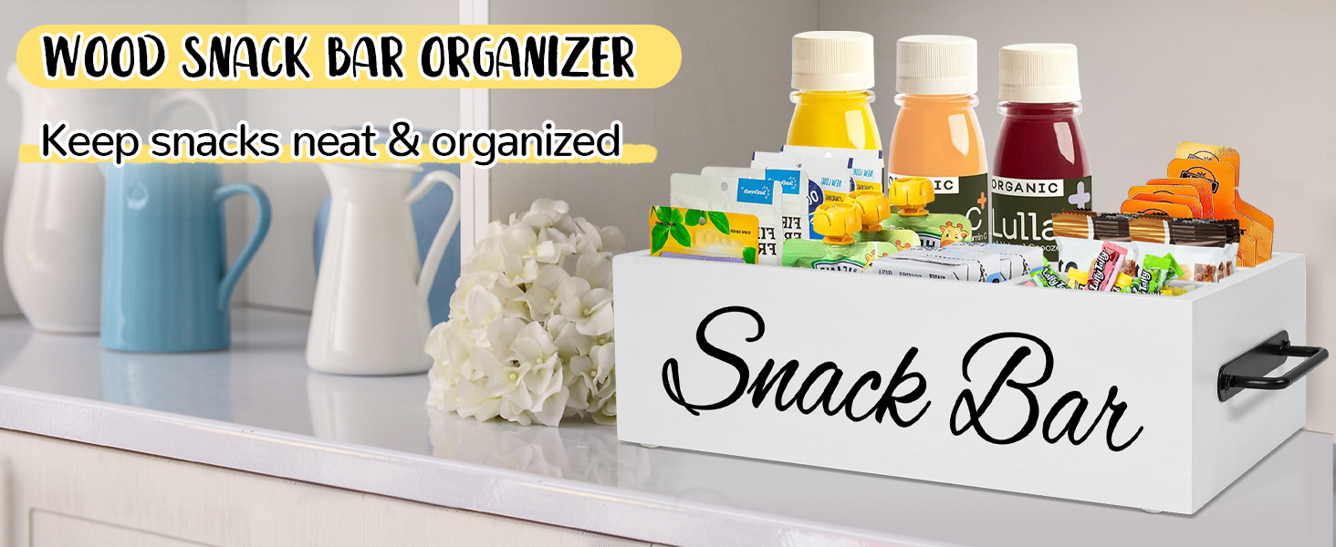 This wooden snack organizer features five spacious compartments and ergonomic handles for easy portability. Its open-top design ensures quick snack access without clutter, while the sleek black farmhouse finish adds a stylish touch to any kitchen, pantry, or entertainment space. Pre-drilled holes simplify handle installation, making it a practical and elegant solution for snack storage and display.