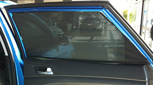 Textile frameless car sun shades • Tailored to fit rear side windows of each car model • Neodymium magnets integrated with the sun shade edge (no direct contact with the car paint) • Fast and easy attachment • Strong sun protection due to high density of the mesh fabric used • Each sun shade folded in a fabric cover (20x15 cm) to fit car door pocket • Recommended maximum speed with open rear side windows: 25 mph • Material: 100% polyester with crease-resistant treatment