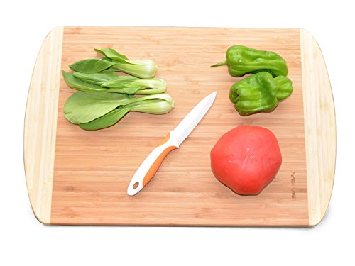 This extra large strong, thick, but beautiful bamboo cutting board is moisture resistant and will last for years. We chose Bamboo because it is one of the most renewable resources on our planet. Our bamboo is raised without pesticides and crafted into this beautiful cutting board without the use of phthalates, formaldehyde or toxic dyes and stains found on many other kitchen prep surfaces. Our eco-friendly board is attractive yet functional - allowing you to cut, chop, prep, and serve your food on the same board. Bamboo is easy on knives, but stronger than maple. This two-colored organic cutting board makes a great gift idea! CARE INSTRUCTIONS: We take great pride in the quality of our products, and with proper care your Yeme bamboo should provide a lifetime of enjoyment and use. Our bamboo is treated with a light mineral oil application before it leaves our factory, so it arrives ready for you to use! Some tips for proper care of your bamboo board: - Coat the bamboo with a food-safe mineral oil. - Hand wash with gentle dish soap and warm water. - Avoid soaking your board, and NEVER use the dishwasher!