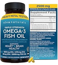 Viva Naturals Omega-3 Fish Oil delivers a potent 2500 mg dose of triple strength omega-3s, including 1500 mg EPA, 570 mg DHA, and 50 mg DPA per serving. Its re-esterified triglyceride form enhances absorption, while rigorous purification ensures ultra-low mercury and toxin levels. Certified by IFOS and Labdoor, sustainably sourced, and pescatarian-friendly, this supplement supports heart, brain, skin, and eye health without the fishy aftertaste.