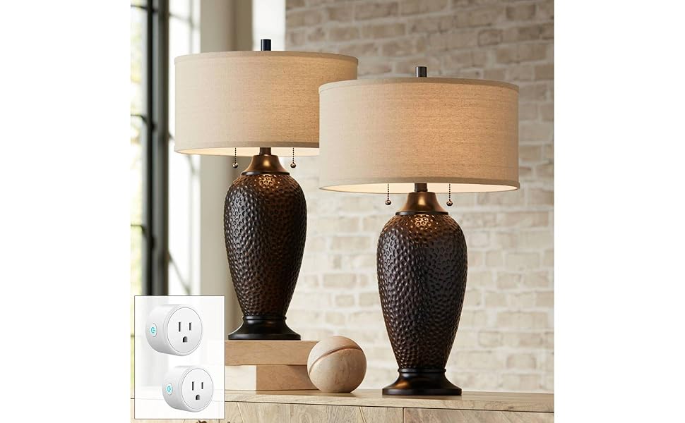 The 360 Lighting Cody Table Lamps Set features two 26-inch tall industrial farmhouse lamps with oiled bronze hammered resin bases and oatmeal linen drum shades. Each lamp supports two 60W LED bulbs and includes WiFi-enabled smart sockets compatible with Alexa, Google Home, and the Smart Life App, allowing remote and voice control. Designed for indoor use, these energy-efficient lamps combine rustic charm with modern convenience, perfect for bedrooms, living rooms, or offices.