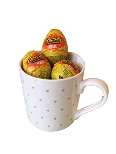 White Mug Small Gold Heart Gift Mug Chocablock full of Reeses Peanut Butter American Candy Chocolate Eggs Perfect for Valentines And Easter Gift by Zella