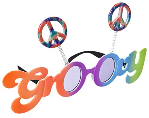 Cool and funky portable 1960s sunglasses in a colourful Groovy design featuring text and Peace Signs. Great decoration for a theme party, record move or carnival.