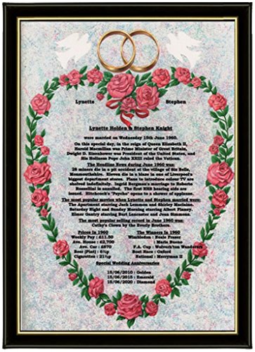 Wedding Anniversaries are very special occasions! Our Personalised Wedding Anniversary News Gifts will take a couple down memory lane back to their wedding day, and provide many interesting facts about the world on the day they were married! Give someone this beautiful Wedding Anniversary News Personalised Gift in our romantically themed background of a Rose Heart called Romance. A unique & very affordable Personalised Wedding Anniversary Gift.