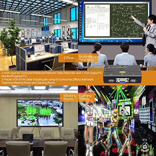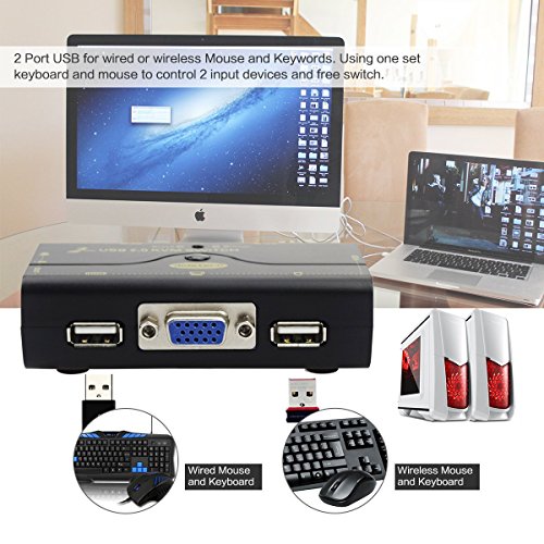 Features: Support Dos, Windows and Mac Operating System Max Resolution support 2048 x1536 Including Audio Speaker and microphone Switch work signal light, Indicates that the currently displayed LED address of the LED is on Support USB2.0 and Connect USB Hub Sharing for USB peripheral device No need adapter for power supply. Interface: Control: 1 x USB Type A for Keyboard 1 x USB Type A for Mouse 1 x USB USB Hub for Print 1 X VGA Type A for Monitor 1 X Mini Stereo Jack for Speaker (Green) 1 x Mini Stereo Jack for microphone (Pink) Input: 2 X VGA Type A for Computers Package List: 1 x 2 Port KVM Switch 2 x 1.2M VGA Cable 1 x User Manual 1 x Warranty Card Description It is supporting Multiple computers or server (keyboards, Video, Audio and Mouse) KVM Switch, it just needing one set USB keyboard and mouse connecting with a monitor to control or view Computers or server. The KVM swith with USB Hub interface is supporting U disk and other USB devices, It is convenient for copy and read dates/documents.