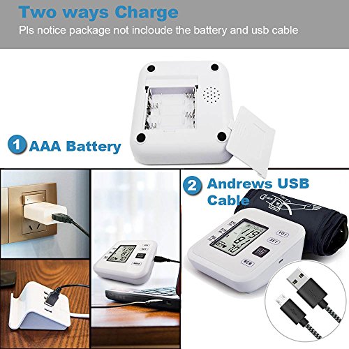 Features: WHAT MAKES THIS A GREAT BLOOD PRESSURE MONITOR? High Accuracy Measuing: ±3mmHg/±0.4kPa(blood pressure); ±5%(pulse rate) Double Users Records 2 Users Measurement Records, Two user memory, So no need to buy 2 pieces blood pressure monitoring kit. Upgrade Technology Newly updated with a premium cuff and a professional kit, Hypertension indicator bar and irregular heartbeat sensor alert you to any issues. Large, backlit LCD display with oversized numbers. Voice Announcements Full voice guidance, blood pressure measurement convenient and accurate. 2 Kinds Chargeable Way USB and Battery are supported, It is your choice which way you like. (4AAA Batteries, USB cable and charger Not included ) Box Contains 1 x Arm Blood Pressure Monitor 1 x Cuff (14-47cm) 1 x Instruction manual 1 x portable bag Tips: 1.Low blood pressure has no definition. Generally people whose high pressure value is not up to 100mmHg (13.3kPa) are called hypotensive 2.At different times of a day,blood pressure change of the same people is also relatively large,only the blood pressure measured at thesame time of aday can be compared,and more rational monitored blood pressure value can be obtained.