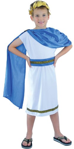 Sizes: 3-4 years; 5-7 years; 8-10 years Childrens Emperor Caesar fancy dress costume This historical Roman costume includes tunic, shoulder drape, belt and headpiece. Ideal for school history days! Measurements: 3-4yrs 110-122cm, 5-7yrs 122-134cm; 8-10yrs 134-146cm Keep away from fire.
