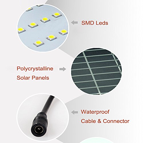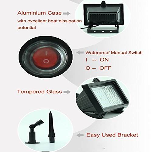 Specifications: Solar Panel: 3W Polycrystalline Solar Panel Battery: 1pc Rechargable Lithium Battery, 3.7V 2000mah Lighting Source: SMD 42Leds floodlight Working Time: 8-10h ( if fully charged ) Charging Time: 6-8h Light Color Options: Pure White / Warm White / Green IP Class: IP65 Working Temperature: -20 ~ +60 degrees centigrade Switch Modes: 1. Manual ON/OFF switch The light can be turned on and turned off by manual switch. 2. Light-sensor switch When manual switch is in ON status, the light will be controlled by light-sensor switch automatically, daytime will be off,nighttime ( or in dark place ) will be lighting on. Solar Panel Size: 215x205x35MM Floodlight Size: 145x98x85MM Floodlight Case Material: Aluminium Application: Widely used in gardens,villa, backyards, building corridor lighting, park, and different kinds of outdoor lighting. Installation Type: 1. The solar panel can be positioned in the ground with bracket and pointed stake. 2. The solar panel can be also mounted on the wall only with bracket. Package Included: * 1pc 3W solar panel with 5M (16.4 feet) lead cable * 1pc SMD 42leds floodlight * 1pc wall mounting bracket with connector (without screws) * 1pc pointed stake for ground insert installation type * 1pc User Manual * Gift Packing Box