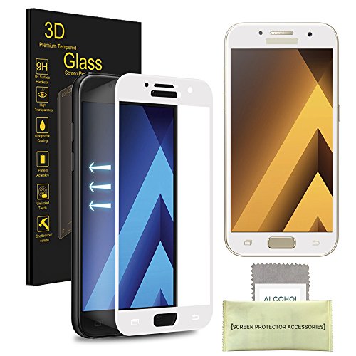 Tempered glass screen protector provides great security and protection for the Screen on your device, and can help save on costly screens replacements. Kit Contains: 1x Tempered Glass Screen Protector, Wet/Dry Wipes, Squeeze Card, Dust Removal Cloth Works with: Galaxy A5 (2017) Color: White Features -Easy to clean: With oil resistant coating, that offers resistance against oil, smudges, fingerprint and scratches, making it easy and hassle free to clean. -HD Clear: With light transmission rate up to 99%, it ensures that your screen performance. -Imported olephobic coating, anti-fingerprint, anti-oil coating on the glass surface, that can efficiently prevent fingerprints residual, you can make a simply oil cleaned. -Delicate Touch: Game run without power, space feeling, give you smooth feeling. Replacement warranty: We will send you replacements free of charge for: -Installation problem such as bubbles or other user error -Damaged screen protectors -Does not fit your device
