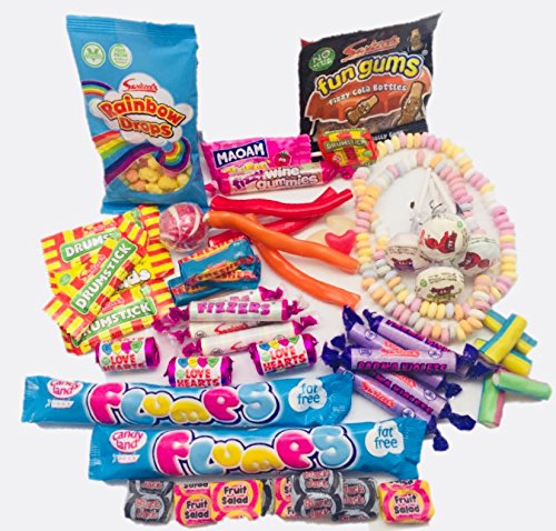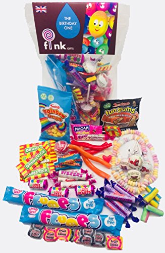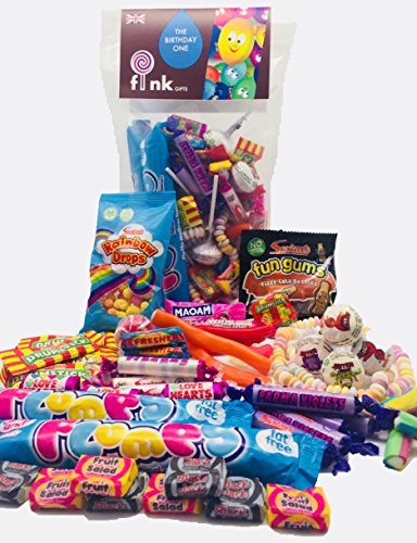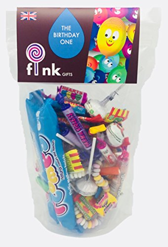 The BIRTHDAY Onefink gifts are proud to present 'The BIRTHDAY One'A collection of some of Britain's best & most loved sweets, perfectly packaged as a birthday gift for that special someone. This gift comes in a re-sealable air tight bag to keep these delicious treats tasting fresh.This is an ideal gift for any sugar lover with popular treats including: Rainbow DropsCola BottlesMaoamCandy NecklaceDrumstickDouble LolliesPink & White HeartsParma VioletsFizzy Wine GummiesLove HeartsFizzersMulti-Coloured BricksFlumpsFruit SaladsBlack JacksRefreshersCherry Filled SticksOrange SticksSwizzler BarsGiant LollyWeight including packaging 480g Best Before 31/08/2018