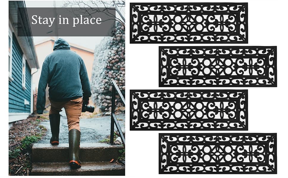 Yesland’s 4-pack rubber stair treads combine eco-friendly natural and reclaimed rubber with a stylish scroll pattern, delivering durable, anti-slip protection for outdoor stairs. Sized at 75 x 25 cm, these mats install easily without adhesives and resist dirt, mud, and snow, making them a smart, functional upgrade for any entryway.