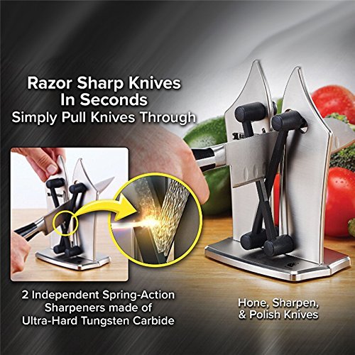 Sharpens Dull Knives in Seconds Kitchen knives are expensive. Just because your old knives are dull doesn't mean you need to toss them in the trash. Give your knives a makeover and restore them to their former glory using kitchen knife sharpener. The professional and portable design works on all types of knife blades, unlike a standard electric knife sharpener or sharpening steel that only accommodates a couple of different blade types. Contours to Your Blade's Shape Fixed edge sharpeners grind-down and destroy your knives. What if your knife sharpener could contour to your blades edge and eliminate the need to purchase specialty sharpeners? replaces your Japanese sharpening stone, water sharpening, stone, and knife sharpening block. Thanks to the two independent spring-action arms made from ultra-hard tungsten carbide, flexes and contours to any blade or angle. Feautres: Professional kitchen knife sharpener with two edges. Adjust to the sharpening angle of the knife blade from 12 to 20 degrees. Quickly sharpen knives with the independent spring action arms. Compatible with smooth or serrated knives. Manufactured from durable & pliable tungsten carbide steel. Sharpen dull or damaged blades in seconds. Best way to sharpen without removing metal. Package Includes: 1 x Kitchen Knife Sharpener, 1 x instructions manual